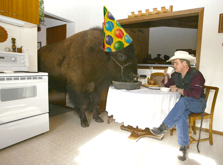 Imagine a buffalo. Now imagine a buffalo in your kitchen. Now imagine that buffalo in your kitchen wearing a party hat, dancing.