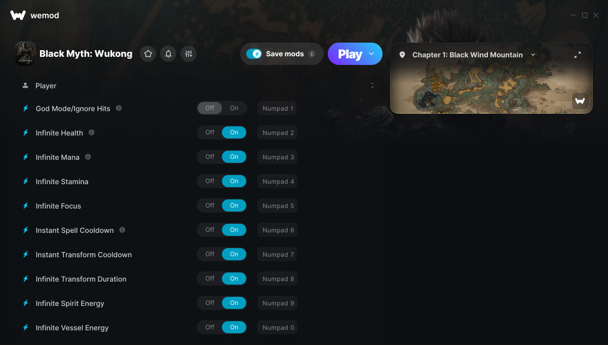 Launch the game first and load a saved game. Once you’re able to move around in the game world, click ‘Play’ in WeMod.