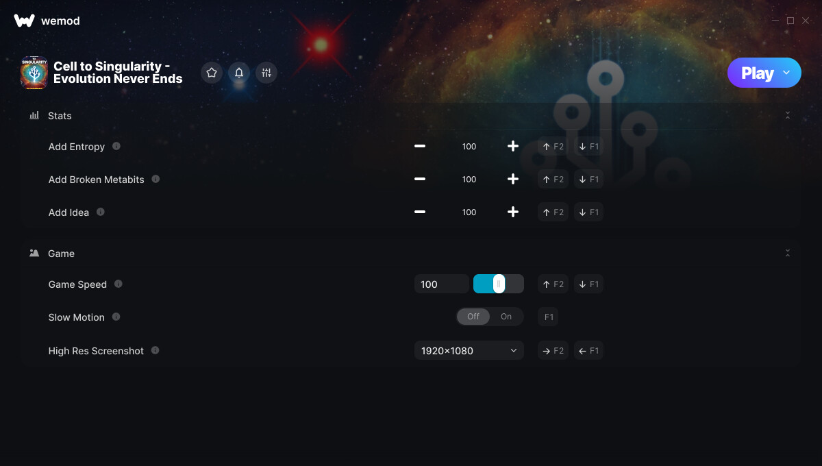 I was going to ask when you guys would update this again? I can’t tell if either the entropy or lightbulb one works, because I get a little more than 10,000x that. (which I would love to see changed/updated) However, I can in fact tell that the darwinium cheat doesn’t work. I have updated both the game and wemod and still not working. Same with the speed change.