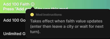 everything was working but eventually the +100 points stopped working. I enjoy this mod but do miss the mod that MrAntifun had on his old site before joining wemod. mostly the mod that let workers fast build. now I have to use a mod pack from steam to edit the world instead of letting the workers just update everything super quick.
