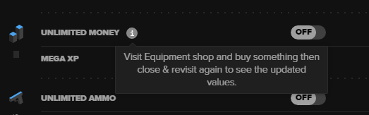 Activated the cheat, buy an improvement for a weapon in the Equipment thing. Closed that and re-enter to the equipment thing and nothing changed.