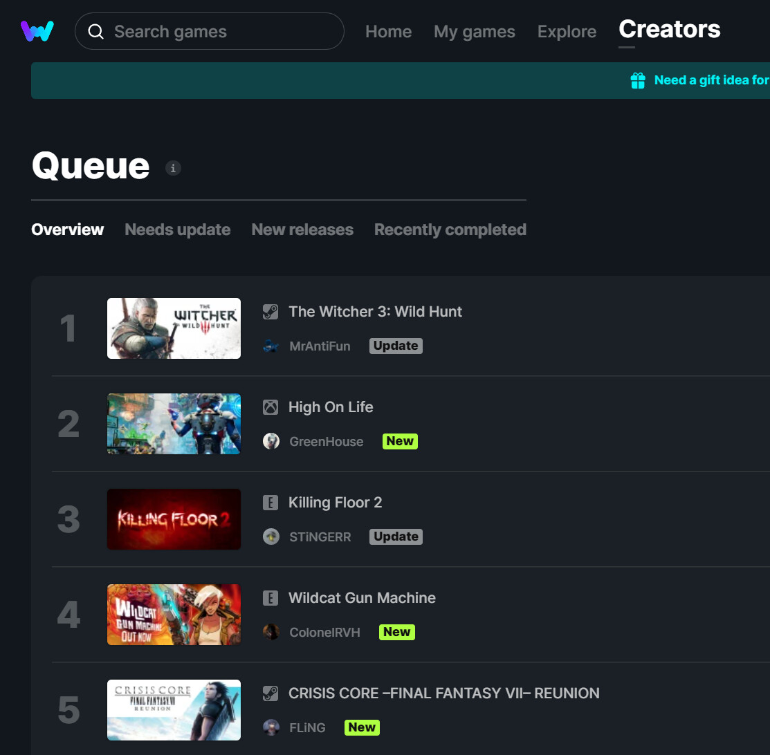 Click the Creators tab in the WeMod desktop app to see the current development queue.