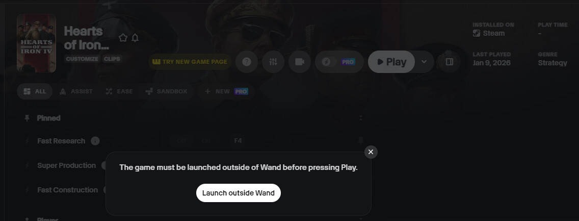 I have the Steam version of the game. I’m trying to launch the trainer by pressing the Play button. After that, a message appears: “The game must be launched outside of Wand before pressing Play.”.