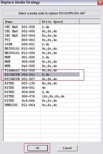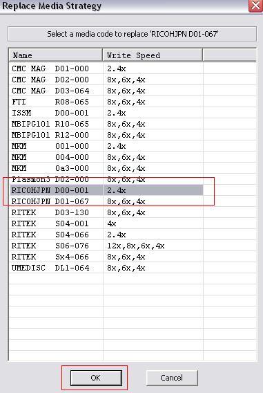 Choose 1 with a 2.4x speed and click ok (NOTE: The Media you take the speeds from will no longer be supported on your burner)
