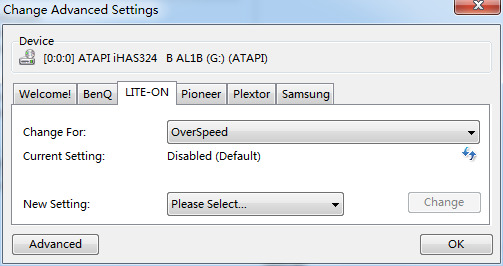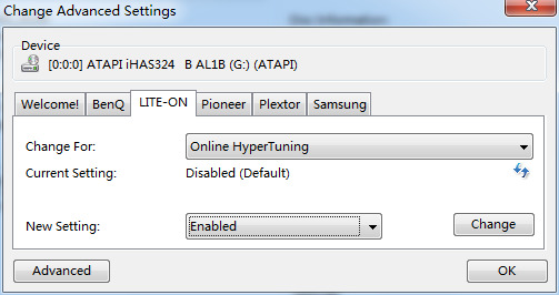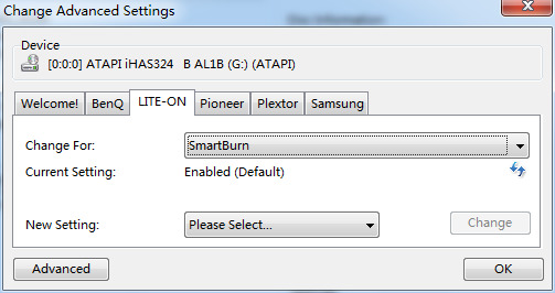 3.Open Lite-On panel in Advanced Settings. It is required to click the individual “Change” button if you changed any setting item and a “Success” message will pop up to confirm the change.