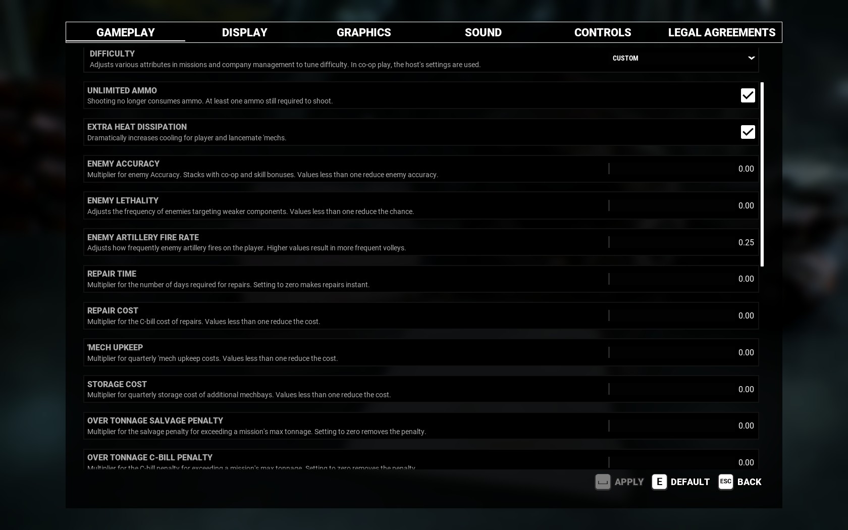 You can also set the Upkeep, Repair Time, Repair Cost, Over Tonnage Salvage Penalty, and Over Tonnage C-Bill Penalty to 0 in that menu.