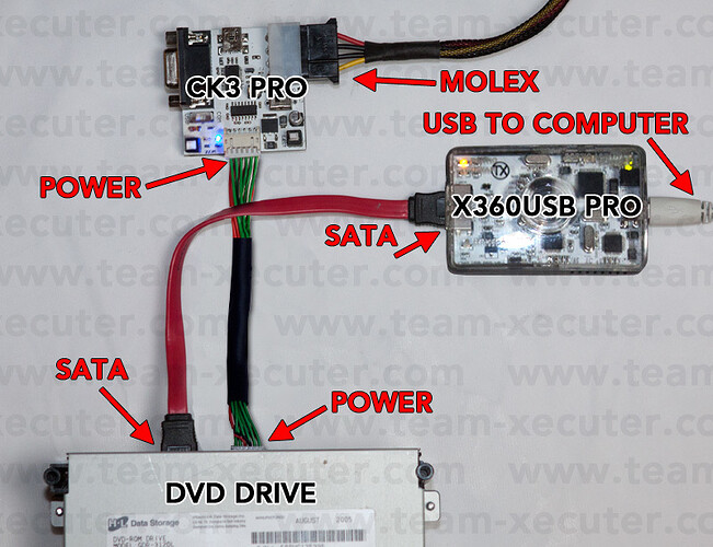It’s very easy to hook up your Liteon DG-16D2S to your PC. Simply connect the DVD power supply (in this case the Xecuter CK3 Pro) to the DVD drive (take care to make sure it is fitted the correct way - the wrong way can damage your drive) and to a molex power cable from your PC or from an external Molex power supply. Then connect the SATA cable from the DVD drive to the X360USB Pro, and then connect the USB cable from the X360USB Pro to a USB port on your Netbook/Notebook/Laptop/Desktop computer.