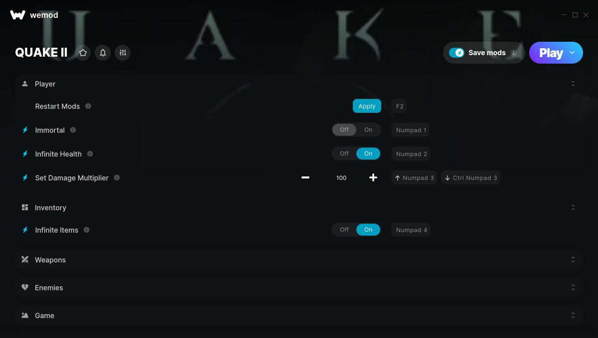 I got the cheats to work for me it seems you have to start quake 2 first and load a level then hit play in wemod and apply the cheats. However, if you were to reload a save or restart the level the cheats do stop working.