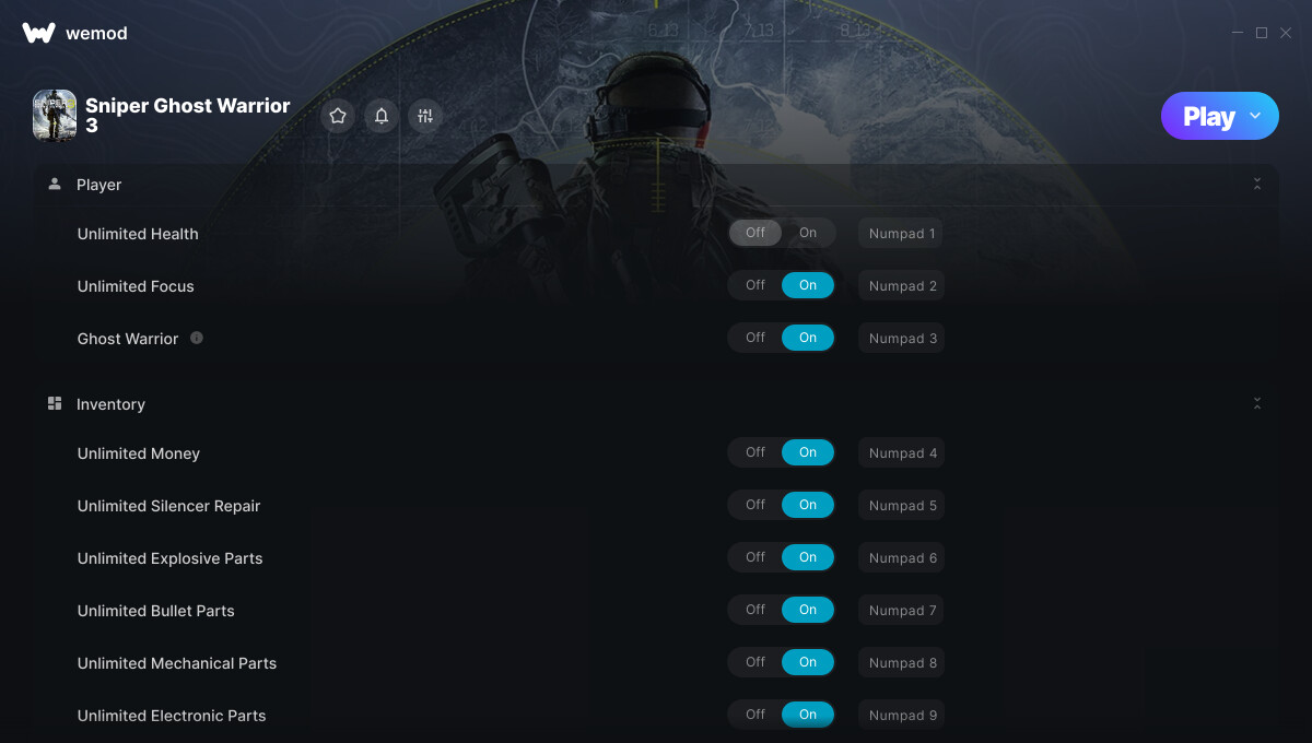 04/28/2017 Unlimited Money cheat added Unlimited Explosive Parts cheat added Unlimited Bullet Parts cheat added Unlimited Mechanical Parts cheat added Unlimited Electronic Parts cheat added Unlimited Food Parts cheat added Ghost Warrior cheat added