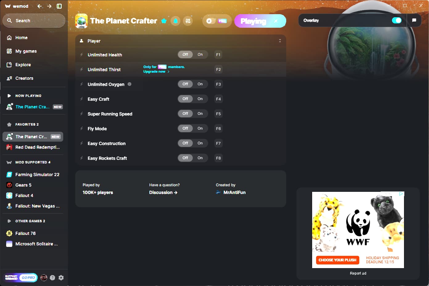 Planet Crafter updated and WeMod stopped working. I saw where the cheat for Planet Crafter has been fixed, it may have but now it requires you to become a Pro member to use the trainer!!!
