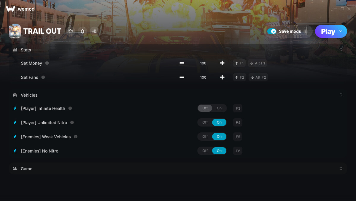 set money & fans & nitros don’t work for me. The game crashes ALOT for me. The infinite health & weak vehicles are the only ones that work. Please fix the rest. THANKS