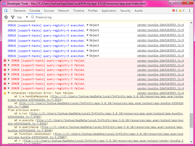 When you open Infinity press Control+Shift+D which will open the dev tools. Then click on the console tab. If there are any errors post them here.