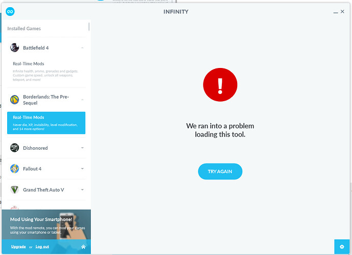 So, I got Infinity a few days ago and it worked fine until today. It launches properly, I can see everything on the main menu but I can’t get it to load any of the Real-Time Mods. I tried restarting the app, my computer, reinstalling and I always run it as admin. What am I supposed to do now? I’m out of ideas.