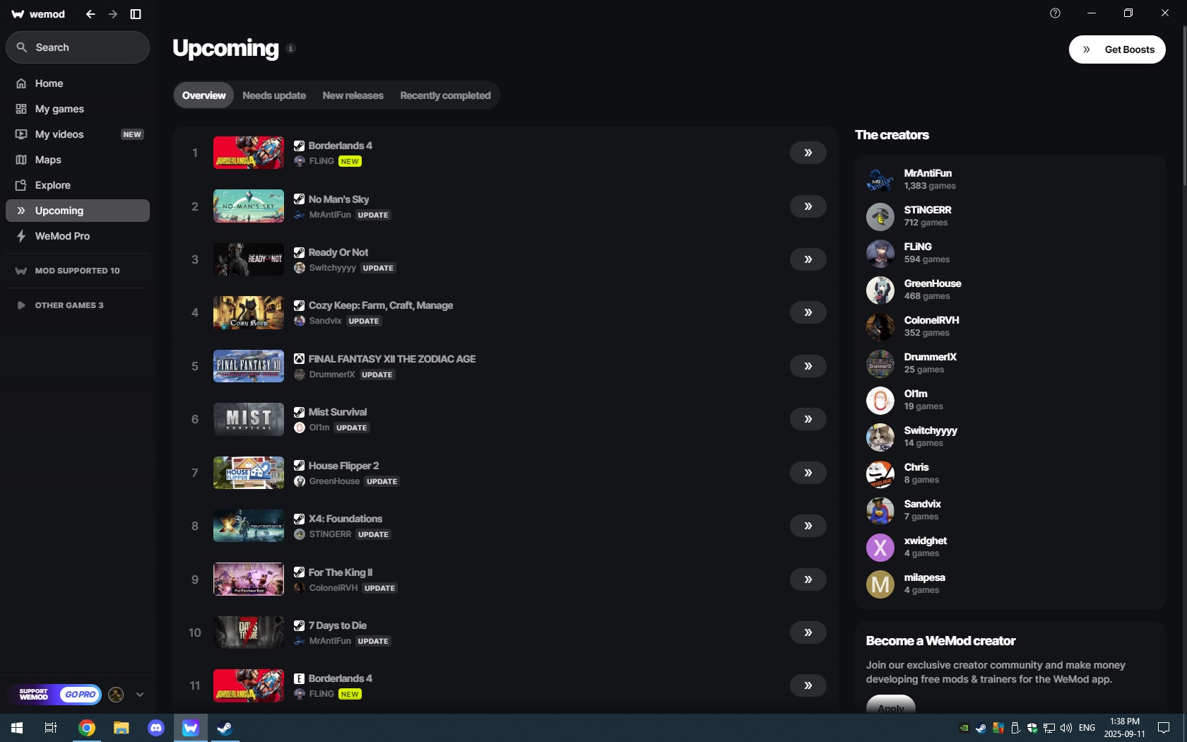 Used to be you could look up which games would have their trainers updated/made in the queue list by clicking on the “Upcoming” from the list on the left. But with the recent changes to the Wemod Application, the “Upcoming” is no longer there on the list. Where might we be able to see the list, so we can boost it accordingly?