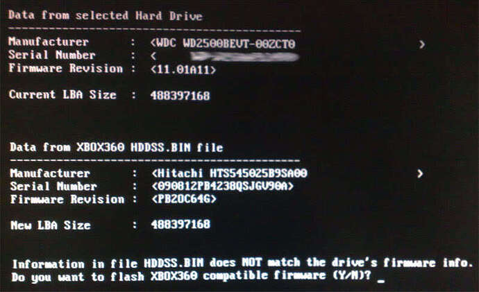 You will now get a message stating that the information in the file HDDSS.BINDoes NOT match the drives FW. Do you want to Flash the Xbox 360 Compatible FW.
